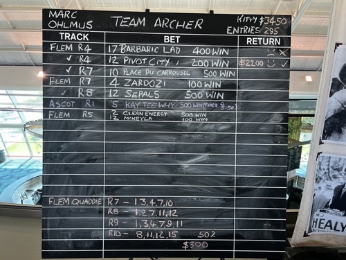 That's another HUGE win for Team Archer, with the captain Marc having a crack with a $500 bet on Race 1 at ASCOT on $5 KAY TEE WHY at $5.50 return.