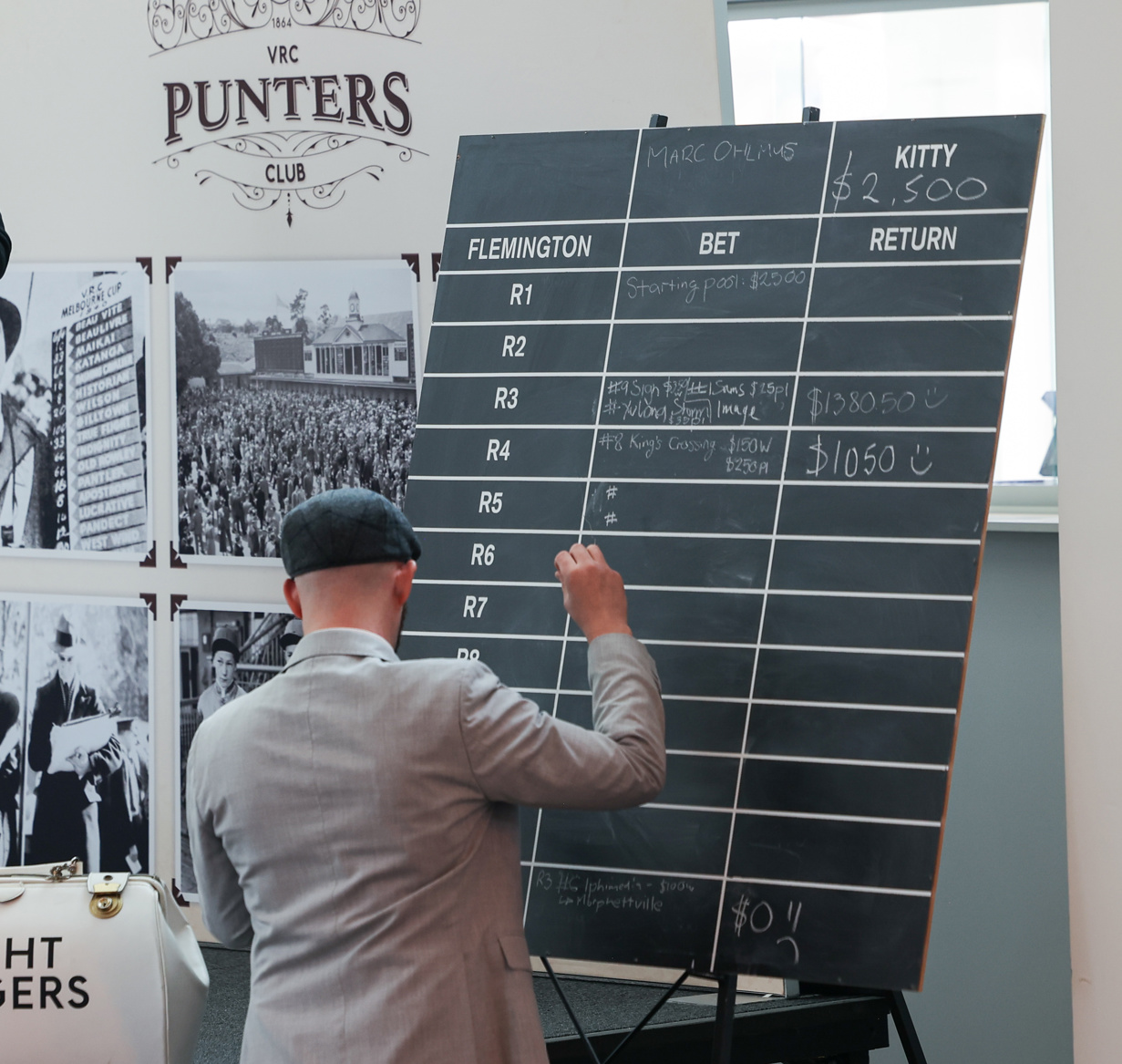 Old school chalkboards for those on course, to keep track of all of today's bets from our team captains - Grace & Marc.