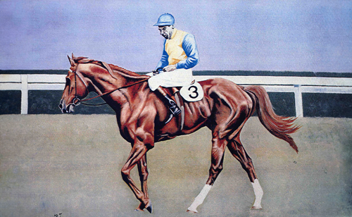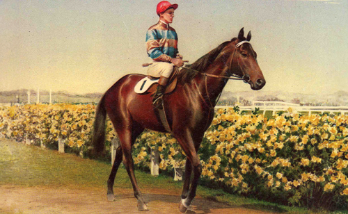 Comic Court was one of the true greats of the Australian turf. He won the Fulham Plate in Adelaide as a 2YO, the Victoria Derby as a 3YO, and a string of weight-for-age races and handicap races as an older horse. His consistent rival was his contemporary, Carbon Copy. In winning the 1950 Melbourne Cup, Comic Court created a new race and course record of 3 minutes 19.5 seconds which stayed intact for 18 years. Three months after the Cup, first up from a spell, he beat the best sprinters over six furlongs at Moonee Valley in the Freeway Stakes. Comic Court’s strapper on Cup Day was the trainer’s 20-year-old son, J.B. ‘Bart’ Cummings, who would go on to train 12 Melbourne Cup winners. Victorian jockey Pat Glennon rode a second Melbourne Cup winner, Macdougal (1959). Comic Court became a successful sire based in South Australia. His son Grand Print was twice placed in Melbourne Cups (1961, 1963).