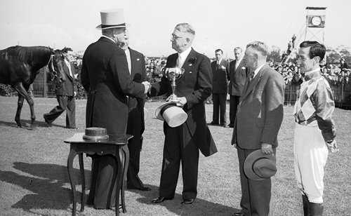 Sirius was owned and bred by Richard Turnbull, who became the first incumbent VRC Chairman to own a winner of the Melbourne Cup. Turnbull had been a committeeman since 1935 and became Chairman in 1942, steering the Club through one of the most difficult periods in its history. Wartime conditions severely curtailed the transport of racehorses, but the 1944 Cup attracted a good field. Sirius won the Herbert Power Handicap and then the Hotham Handicap leading into the Cup, which for the third successive year was run on a Saturday. Ted Fisher was a veteran Flemington trainer who had first come to Melbourne in 1911 as a jockey after riding with success for several seasons in Singapore. For Darby Munro, this was the second of his three Melbourne Cup victories. Sirius later stood as a sire at Sir Chester Manifold’s Talindert Stud before being retired to Queensland.
