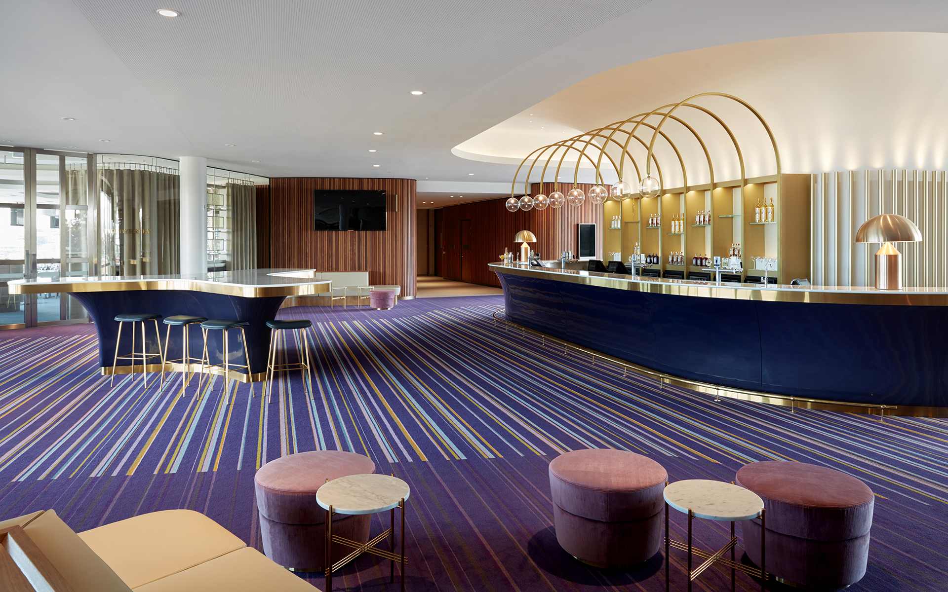 The free-flowing space is adorned with endless touches of velvet and leather seating, complemented by luxurious gold detailing and a rich palette of regal purples and navy blues.